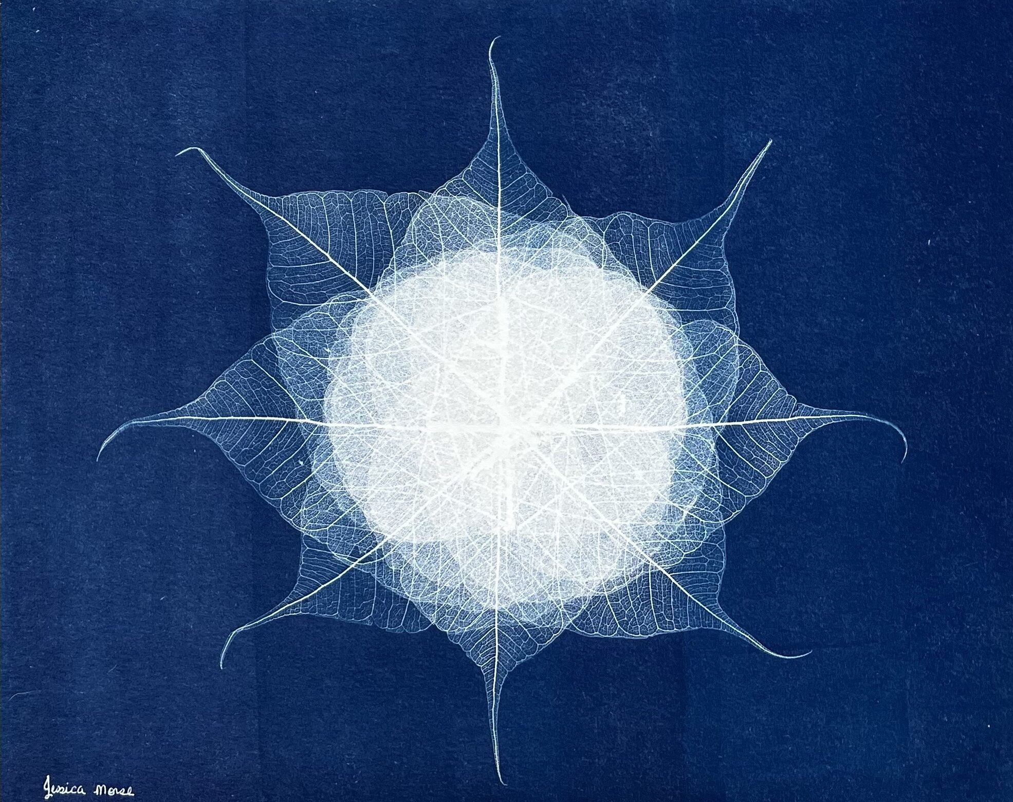 Delicate Bodhi leaves radiate outward in a mosaic resembling a blooming flower, their fine veins and graceful shapes captured in luminous indigo. Symbolic of awakening and inner peace, each leaf contributes to a quiet harmony within the whole. Created with sunlight on premium watercolor paper, this traditional cyanotype invites stillness, beauty, and contemplation.