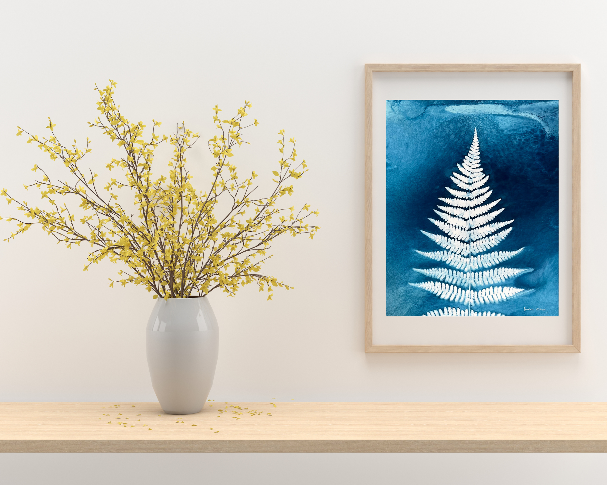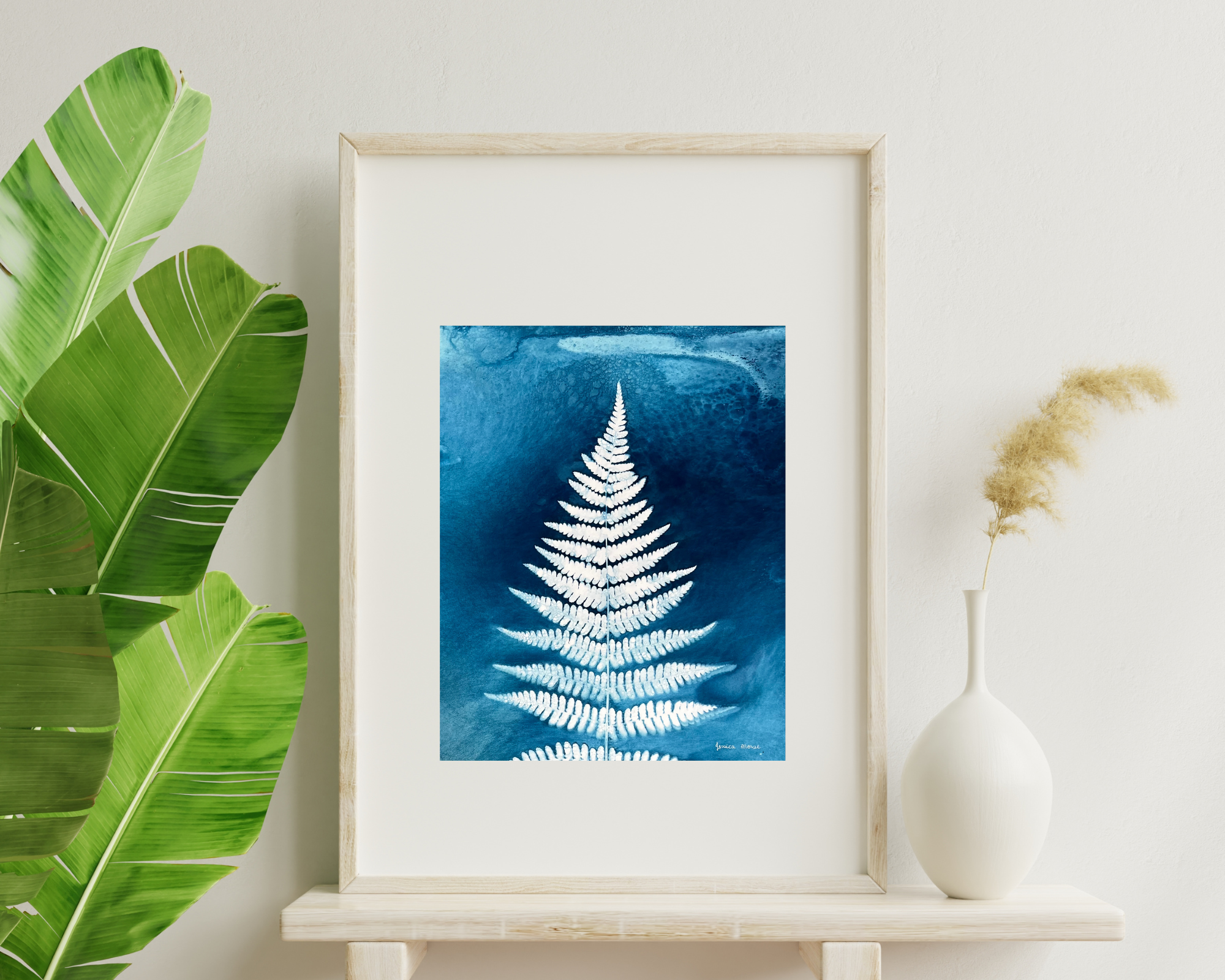 A single fern takes center stage in this wet cyanotype, adrift in a light blue background.