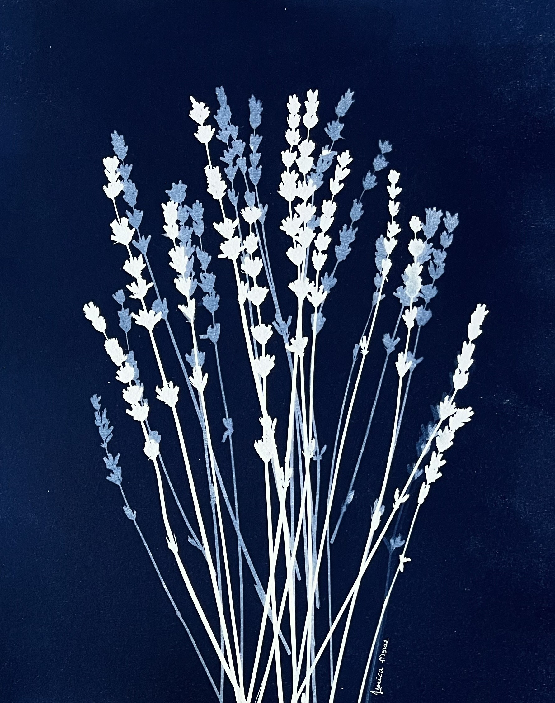 Multiple stems of lavender rest gently across a rich indigo background, each captured with varied exposures that create depth, softness, and quiet rhythm. This traditional cyanotype reveals the graceful architecture of each bloom—some crisp and detailed, others more ethereal—echoing the calming nature of lavender itself. Crafted in sunlight on premium watercolor paper, this piece invites stillness and reflection.